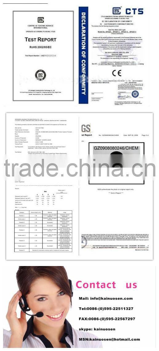 A: Quality is priority. Quanzhou Kainuosen Import & Export Co., Ltd. always attach great importance to quality controlling from the very beginning to the very end. Our factory has gained TUV Rheinland Assessment Report ,FDA,LFGB,DGCCRF safe food test via SGS.