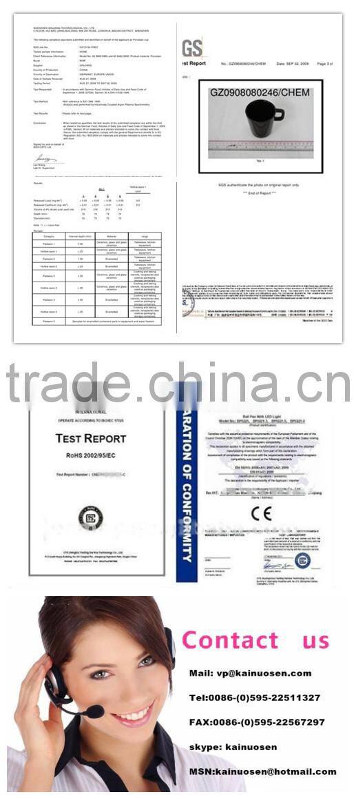 A: Quality is priority. Quanzhou Kainuosen Import & Export Co., Ltd. always attach great importance to quality controlling from the very beginning to the very end. Our factory has gained TUV Rheinland Assessment Report ,FDA,LFGB,DGCCRF safe food test via SGS