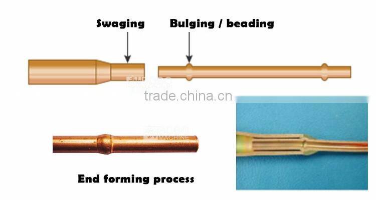 Automatic copper capillary tube cut off machine with tube end forming process is special designed for the capillary tube process, including the straightening, cutting, end forming (beading, bulging, flaring, etc). The cutting can be chipless from coil copper tube, and there is no shrinking or necking on the cutting section.