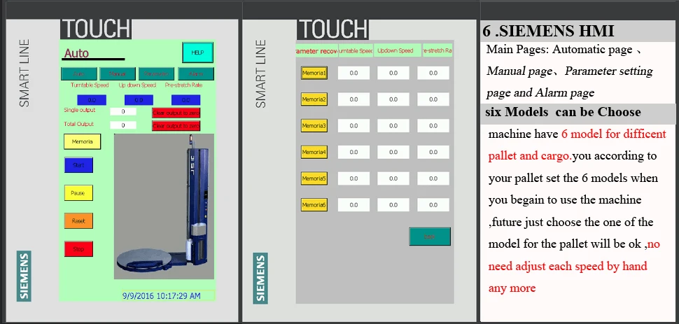 The touch screen can set the "turntable speed .up& down speed and film carriagre speed directly" and we also prepare for our customer 6 wrapping model for they pallet ,most of customer they have diffierent pallet to wrap ,so the different pallets need different wrapping speed ,wrapping force ,the customer just need set the 6 model one time ,then just choose the right model for they pallet , no need adjsut the parameter every time any more.