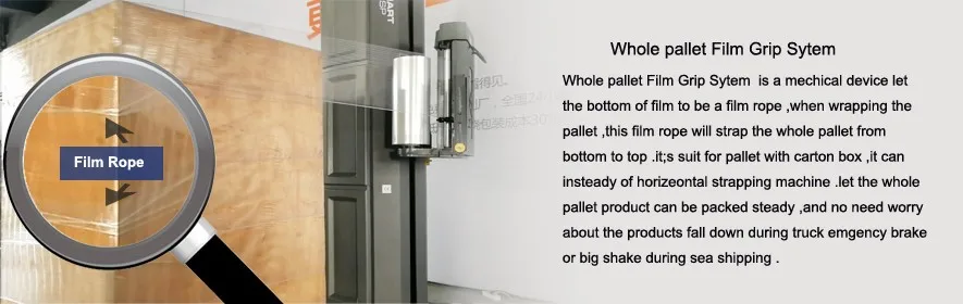 Whole pallet Film Grip Sytem is a mechical device let the bottom of film to be a film rope ,when wrapping the pallet ,this film rope will strap the whole pallet from bottom to top .it;s suit for pallet with carton box ,it can insteady of horizeontal strapping machine .let the whole pallet product can be packed steady ,and no need worry about the products fall down during truck emgency brake or big shake during sea shipping .