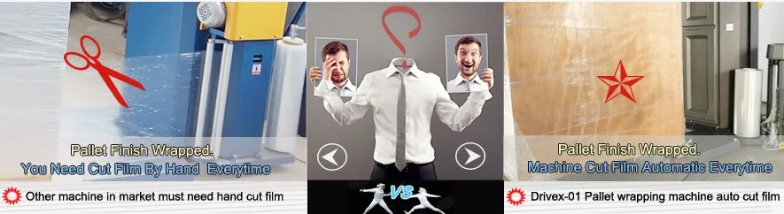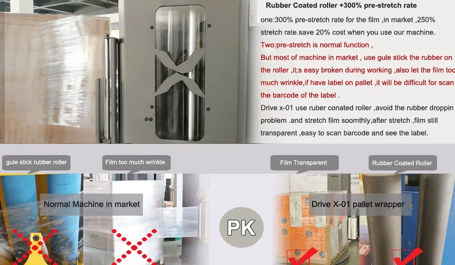 Drive x-01 use ruber conated roller ,avoid the rubber droppin problem .and stretch film soomthly,after stretch ,film still transparent ,easy to scan barcode and see the label.