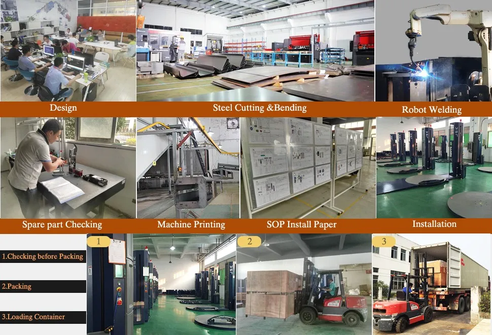 A good machine must need a good beginning ,this beginning means good design,if the design have problem ,no matter how good the spare part you use ,all is in vain ,so pallet wrapper have 18 engineers just study and design it ,after Desgin ,we test the sample ,after everything is fine ,we begin to manufacture the machine ,we use good laser cutting machine and good bend machine to bend and cut the steel ,we use robot to weld the machine ,after welding our worker will check all the parts ,and then printing the machine ,the install worker must according to our SOP to install the machine ,make sure no missing parts ,after intallation we test each machine ,everything is fine ,wer pack the machine and ship out ,about the packing the machine ,we use steel+wooden box ,pallet wrapping machine easy damage during transport ,so we use the steel box and surface covered with wooden board ,it will be safety for the machine,when customer get the machine ,everything is fine .