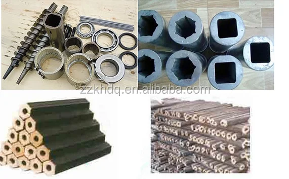 The coconut shell briquette machine has spare parts, such as propeller, heating rings, moulding tube, and wear-resistant cover etc.