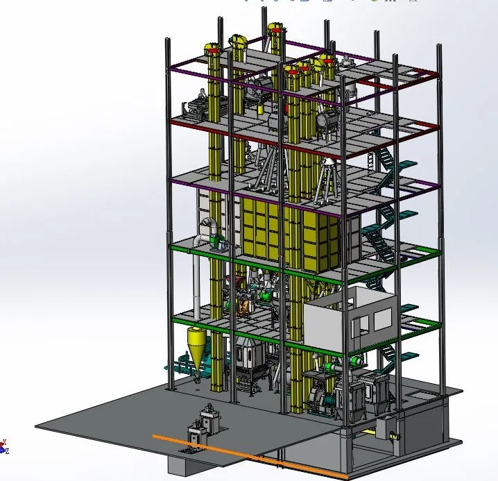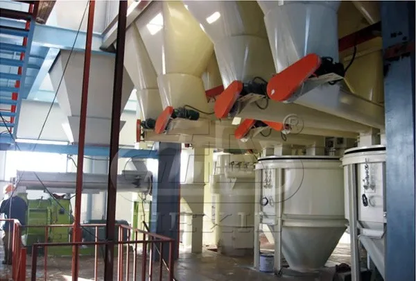 Poultry feed product line include 6 process section: raw material reception and cleaning, crushing section, mixing section, pelletizing section, cooling and crushing section, screening and final package section. Auxiliary equipment include oil feed system, steam supply system and air compress system.