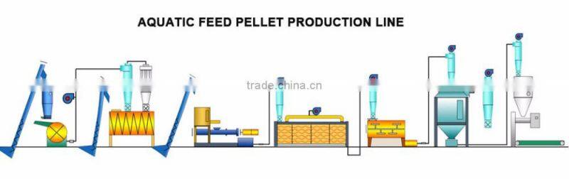 Blender→elevator→Storage→Conditioner→Steam Fish food extruder→Air conveyer→Steam Dryer→Hoister→oil sprayer→Double Drum→Cooling conveyer→Sifter→Packing Machine.