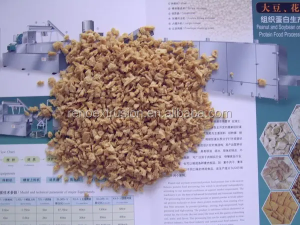 AutomaticTextured soya protein food production line Textured soya protein food machinery Textured soya protein food extruder Textured soya protein food processing line is suitable for producingTextured soya protein food in all shapes. It is widely used with a high temperature soybean flakes and as basic raw material, with a dry twin-screw extrusion machine, through strong squeeze instantaneous puffing, shaped different shapes soya food material ,After drying and surface seasoning coating ,its shaped all kinds of soya protein food finally .