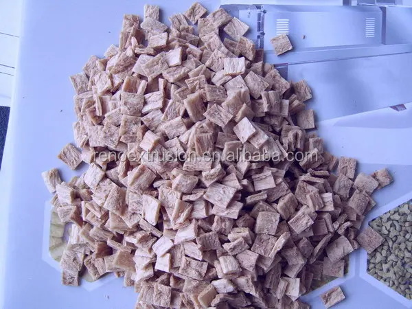 AutomaticTextured soya protein food production line Textured soya protein food machinery Textured soya protein food extruder Textured soya protein food processing line is suitable for producingTextured soya protein food in all shapes. It is widely used with a high temperature soybean flakes and as basic raw material, with a dry twin-screw extrusion machine, through strong squeeze instantaneous puffing, shaped different shapes soya food material ,After drying and surface seasoning coating ,its shaped all kinds of soya protein food finally .
