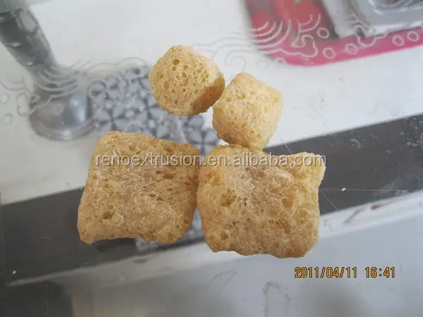 AutomaticTextured soya protein food production line Textured soya protein food machinery Textured soya protein food extruder Textured soya protein food processing line is suitable for producingTextured soya protein food in all shapes. It is widely used with a high temperature soybean flakes and as basic raw material, with a dry twin-screw extrusion machine, through strong squeeze instantaneous puffing, shaped different shapes soya food material ,After drying and surface seasoning coating ,its shaped all kinds of soya protein food finally .
