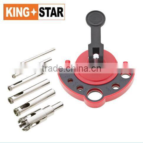 Convenient guide jig with mated diamond bits and a no-slip suction cup ensure perfectly centering holes in otherwise difficult to drill materials. All are part of this set that performs a simple job that would be impossible using the myriad of traditional bits one usually has around and makes it a pleasure to use and invaluable to have in your toolbox when you need it