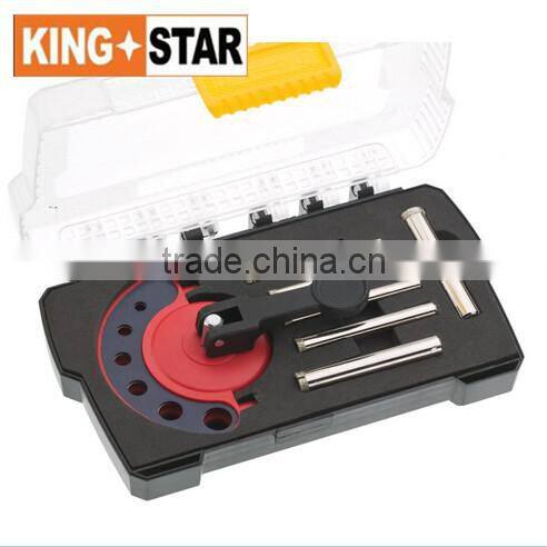 This set features six diamond bits that cut through a variety of materials from mirror to porcelain. Each bit fits a specific hole on the guide for centered cuts. The set includes the following popular bit sizes: 3/16, 1/4, 5/16, 3/8, 1/2 and 3/4-inch.