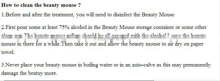 During the treatment,never apply high pressure! Even with higher pressure the micro-points cannot roll any deeper into the epidermis.Each skin is different in sensitivity,slight tingling or itching maybe felt,this is mormal. Use two to thress nights per week as tolerated.Using gentle pressure,roll the Beauty Mouse 4 times over each area in each direction ,vertically,horizontally and in both diagonals.