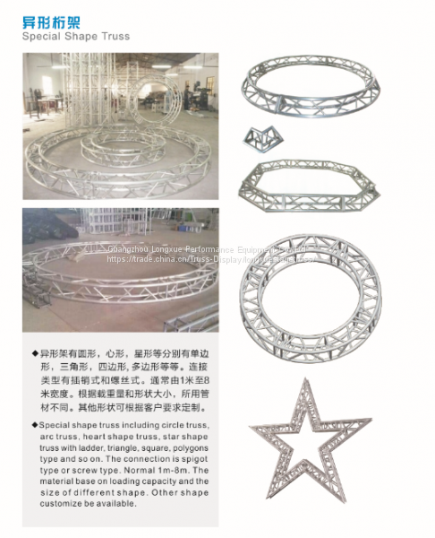 Special shape truss including circle truss,arc truss,heart shape truss,star shape truss with ladder,triangle,square,polygons type and so on.The connection is spigot type or screw type.Normal 1m-8m.The material base on loading capacity and the size of different shape.Other shape customize be available.