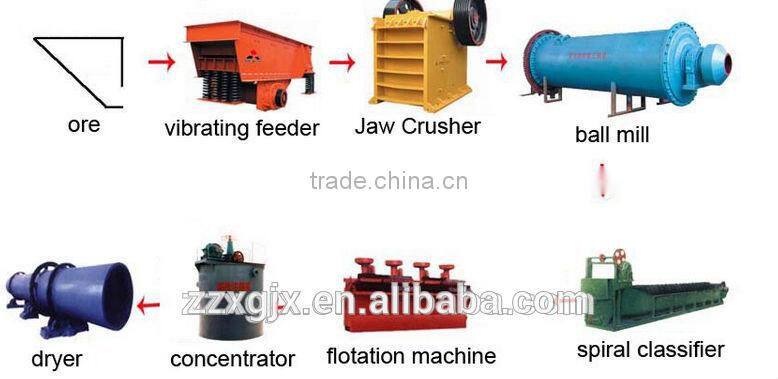 At first, ore is preliminary broken by jaw crusher. When it has been broken to a reasonable size, it will be send to ball mill symmetrical through bucket and feeder. Next, ball mill will crush and grand ore then go to next step- Classification.