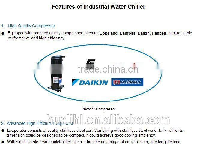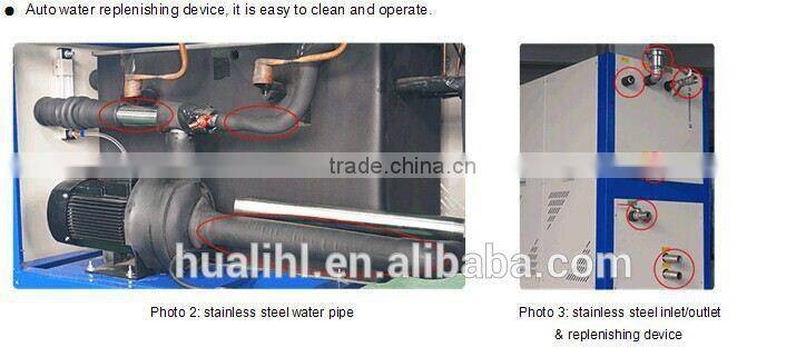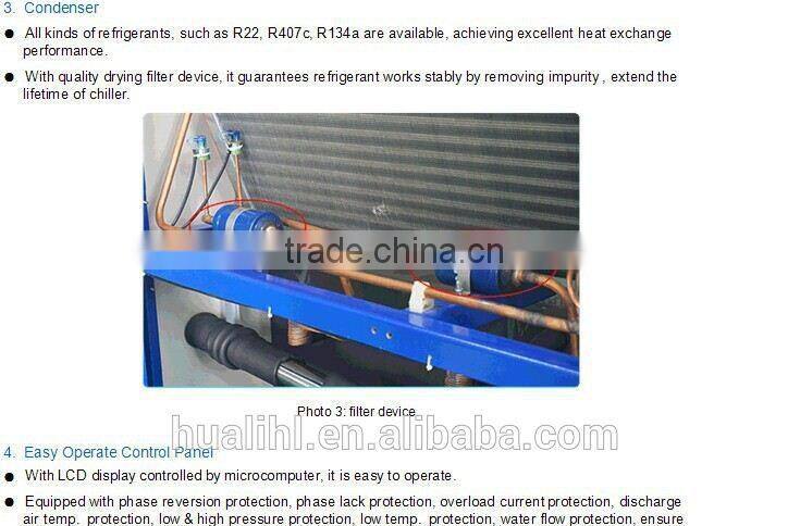 Air water chiller including water pump and water tank. Client can choose with or without water pump and water tank.Compressor: Hitachi, Daikin, Danfoss, Copeland, client can choose the compressor Water cooled type: condenser and evaporator use Shell-and-tube. Air cooled type: Shell-and-tube condenser, finned type evaporator.