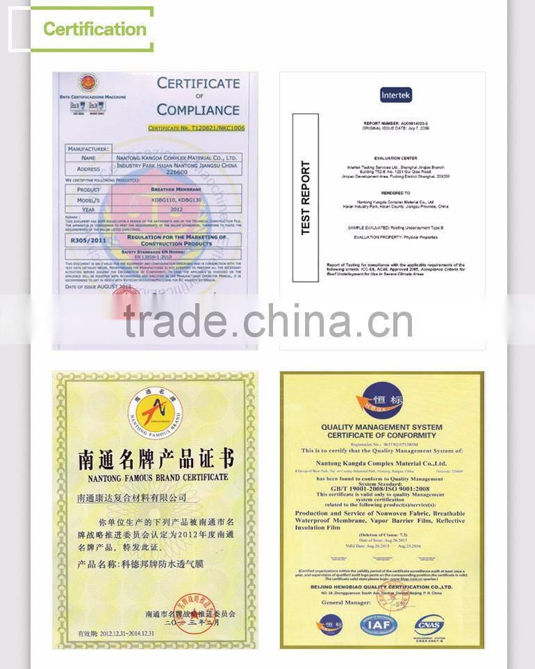 As Chinese first factory of breathable membrane, Nantong KangDa has been well known by both Chinese and European customers. We have the advanced technology and equipment from Italy. KangDa Brand breathable membrane quality now is on the top of China and the world.