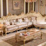 Luxury European Style Solid Wood Golden Carving Genuine Leather Back Matching Fabric Seat Living Room Corner Sofa Set