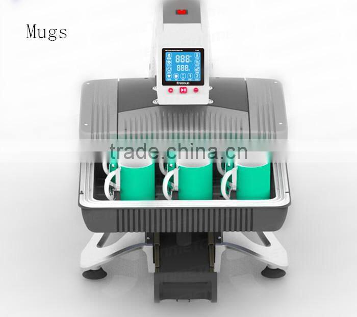 The machine can transfer T-shirt, 4 phone cases, 8 mugs,special shape mugs, plates, glass and rock frames,etc..