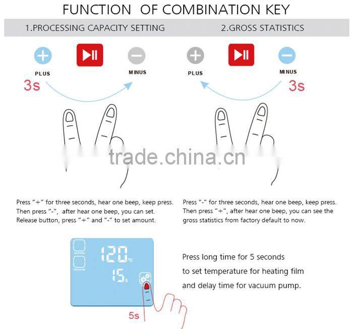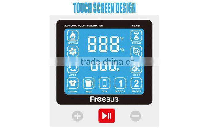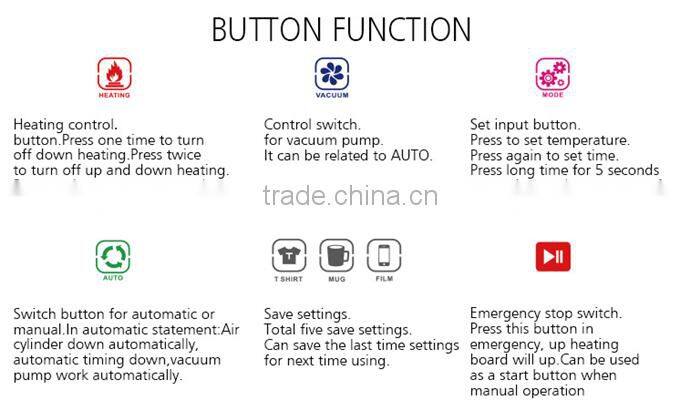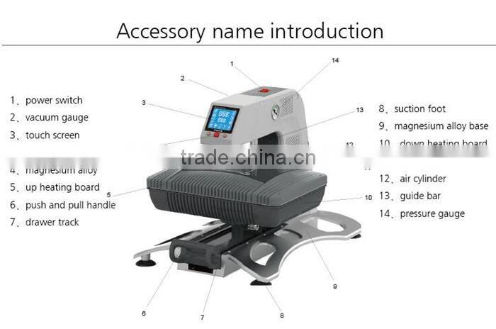 The New 3D automatic sublimation vacuum machine uses aluminum die-casting process,light weight and solid structure, independent research and development of the control circuit . Implement fully automated operation,pneumatic lifting,large LCD touch screen, 5 groups setting savings function,powerful creative design of lifting board,quickly adjust machine functions.