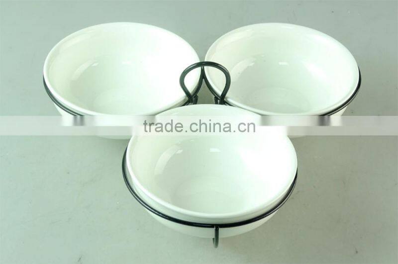 3pcs White Ceramic Bowls With Black Metal Holder Set In Stock Wholesale