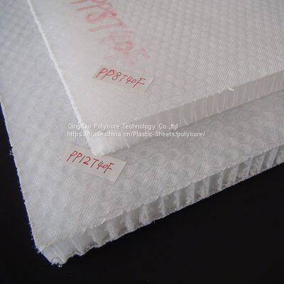 PP honeycomb sheet laminated with polyester tissue on both sides. This allow better bonding of the honeycomb to different surface panel. In addition to the tissue, honeycomb can laminated with a layer of PP film . The film under the tissue acts as a barrier to prevent resin leaking into the core thus save resin consumption in next assembly process Besides there is more stiffness plastic sheet with more thicker tissue.
