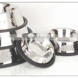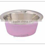 Description: Stainless steel pet bowls are attached with rubber grip on round border for non-skidding while feeding to pets.
