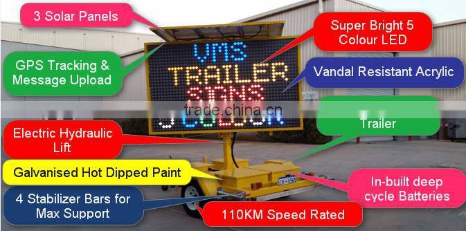 VMS Trailers offers a wide range of Trailer VMS or Variable Message Board trailers throughout Australia and all over the world. VMS trailers to all major Australian capital cities including Sydney, Melbourne, Brisbane, Perth, Adelaide, Darwin. Our VMS trailers are also used all over the world including Asia, Europe and North America and we are constantly hearing from new clients in emerging markets enquiring about our VMS trailers. Electronic Trailer signs for Australia is becoming very popular mainly because it is a cost effective form of marketing that really works.