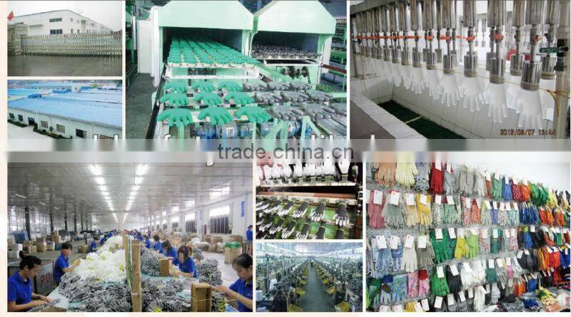 The manufacture area is more than 60,000 sqm2, having 5 sales divisions for different protection products. In order to provide a broader scope of products, We invested an extra 20million RMB to produce various gloves with its 5 affiliated companies, including Nitrile dipping glove, Latex dipping glove, Polyurethane glove, PVC coating glove, cut-resistance glove, heat resistant gloves,String knit glove, gardening glove, PVC dots glove, cow leather glove, pig leather glove, household latex glove, PE glove, Vinyl exam gloves,Anti-static gloves and so on, which are applies to the household, medical, electronic, agriculture, mechanical, automotive, Mining,construction.welding,metal parts industries.