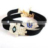 Rhinestone Inlaid Hamsa Hand Evil Eye Charm Suede Leather Bracelet