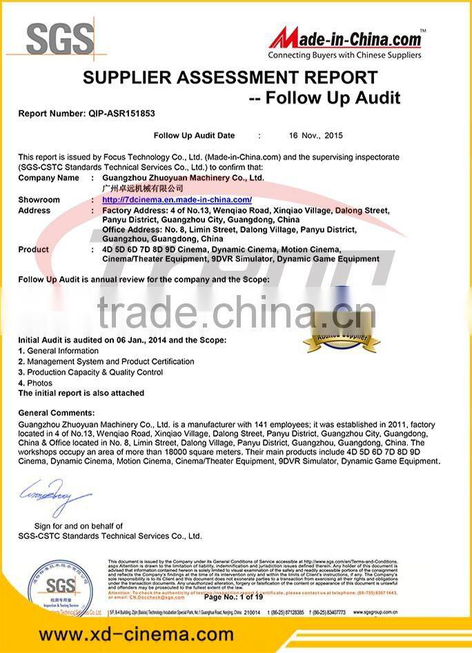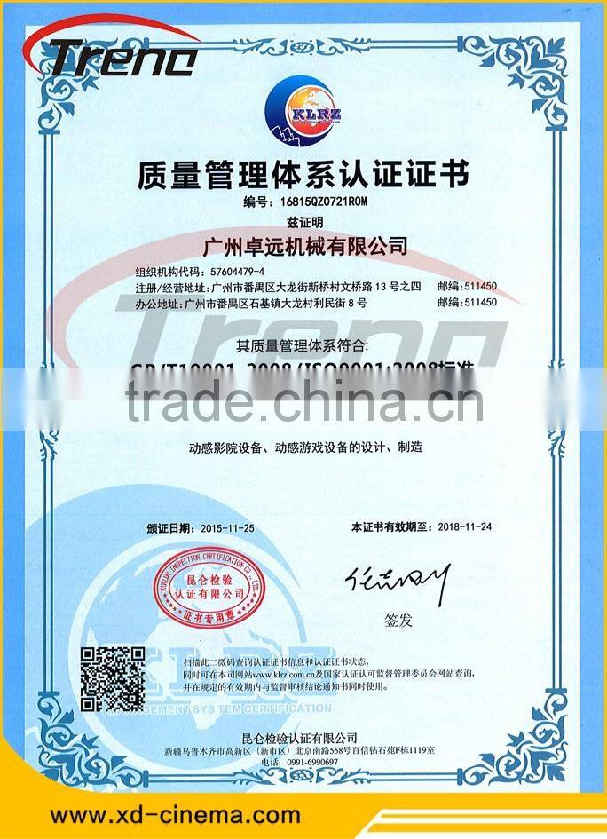 Guangzhou Zhuoyuan six-seats 9D cinema not only solves the problem of 5D/7D cinema traditional storefronts and fixed screen dependence,but also break the limitation of audience numbers in 9D cinema. Larger flow, Higher profit!