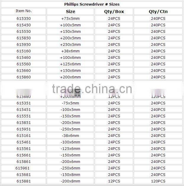 Packing: Phillips Screwdriver # Sizes Aavailable package: Natural Packing or Accoding to Customer's Asked Phillips Screwdriver # Sizes Qty/Ctn:240pcs or according to weigth and carston size. Phillips Screwdriver # Sizes Shipping: to be covered by sea, which is an economical way.