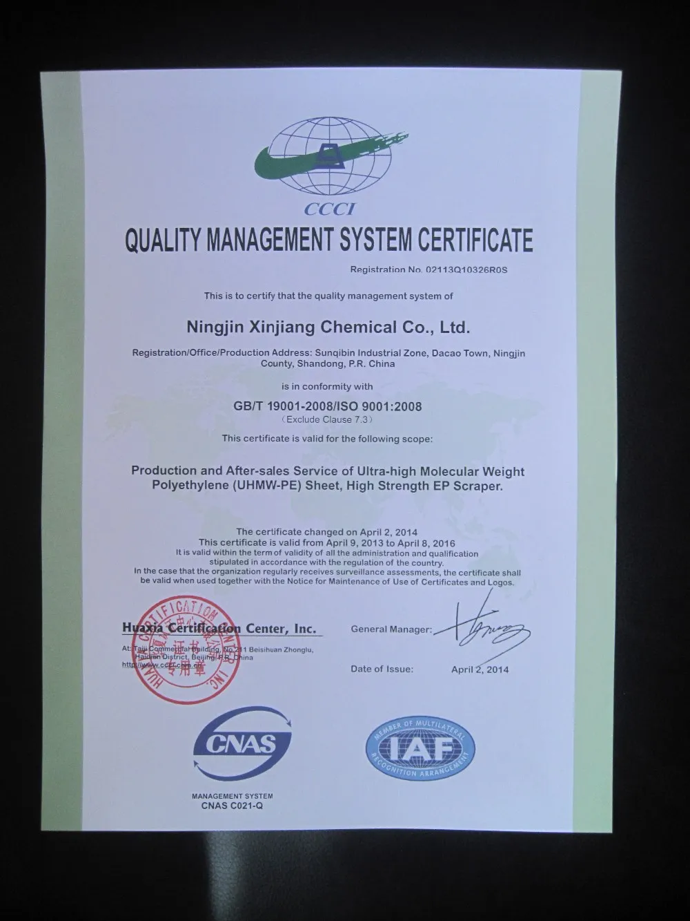 We have gained many certificates from government in the field. We are specialized in UHMWPE products, like UHMWPE Sheet , UHMWPE Fender, UHMWPE linings for hoppers and chutes, and it's machined parts.