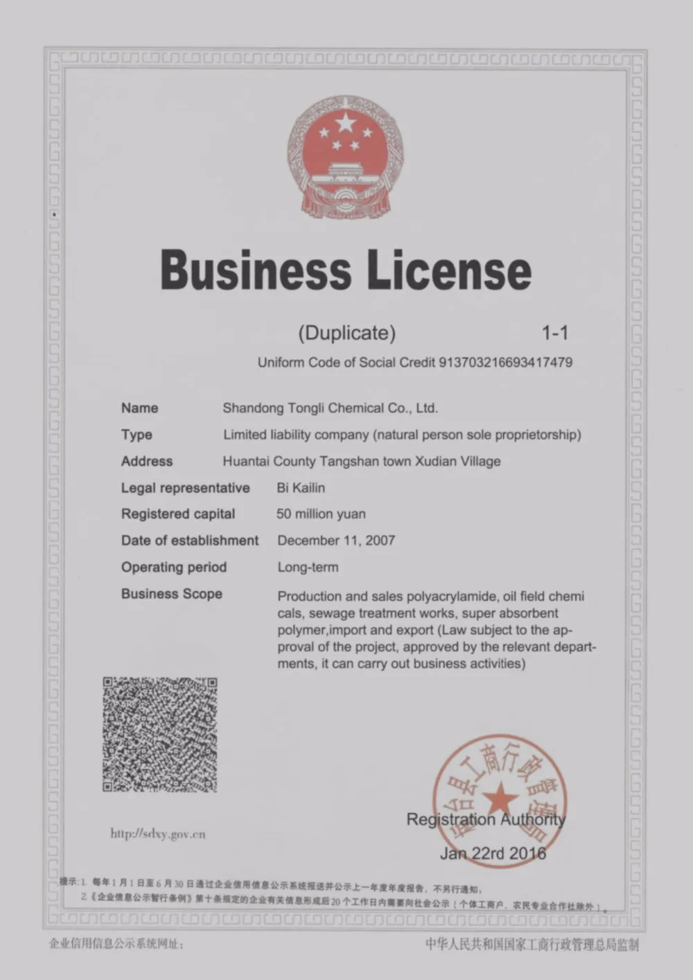 Shandong Tongli Chemical Co., Ltd was founded in 1993, is located in Huantai county, Zibo city, Shandong province. The company has 260 employees including15 in senior title and 13 in middle title.