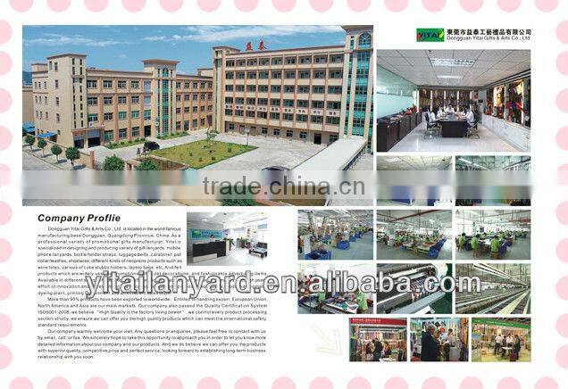 Our main products: lanyards, mobile phone lanyards, bottle holder straps, luggage belt, carabiner, pet collar & leashes, shoelaces, different neoprene products, such as wine totes, various of cok stubby holders, laptop bags, etc.