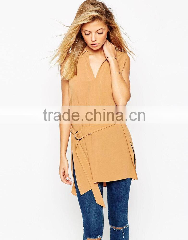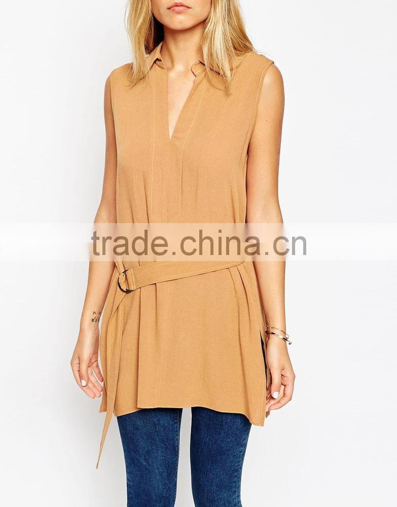 2015 New Fashionable Factory Belted Sleeveless Utility Tunic Top With V-neckline