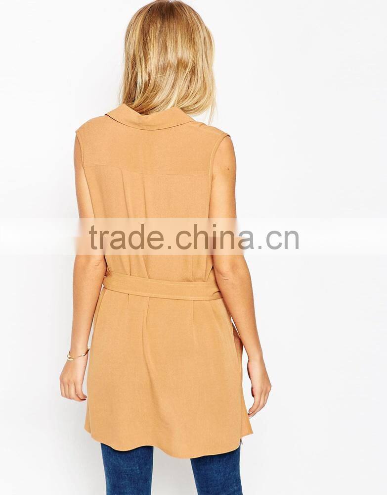 2015 new fashionable factory Belted Sleeveless Utility Tunic Top with V-neckline