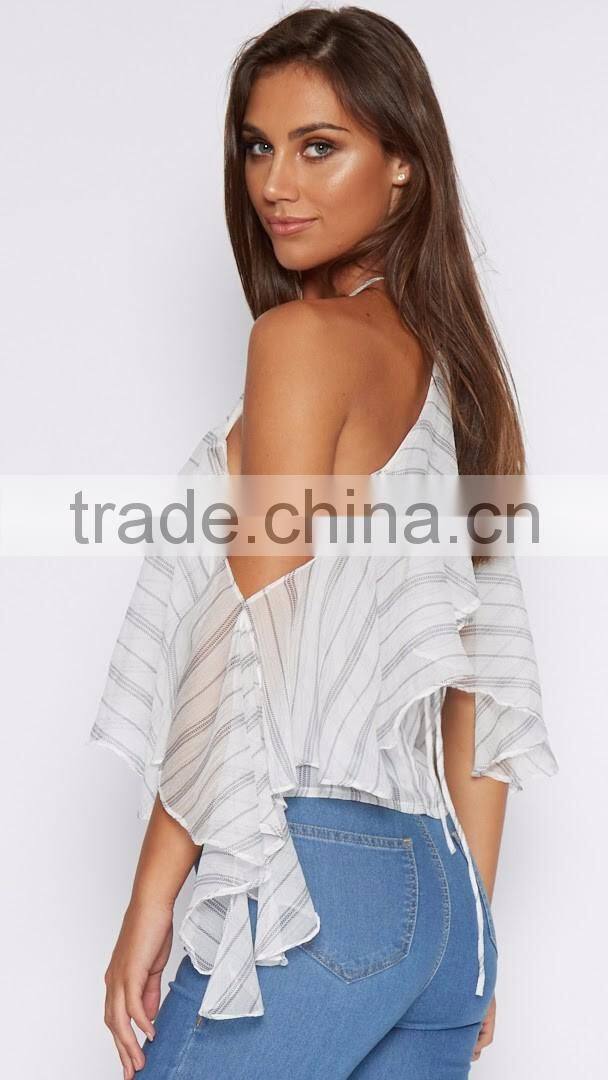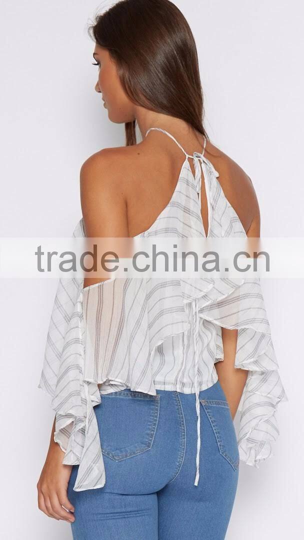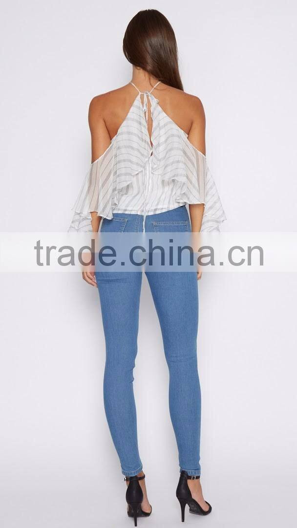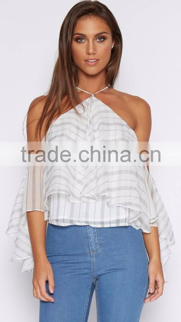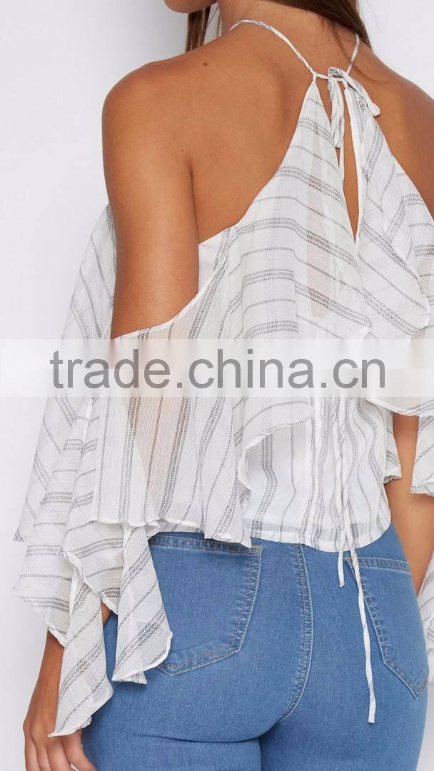 Latest Design Halter Neck off Shoulder Woman Tops Summer Ruffle Tops