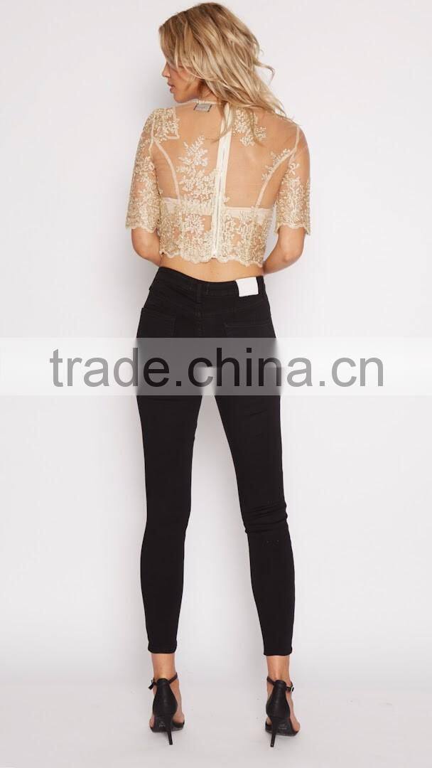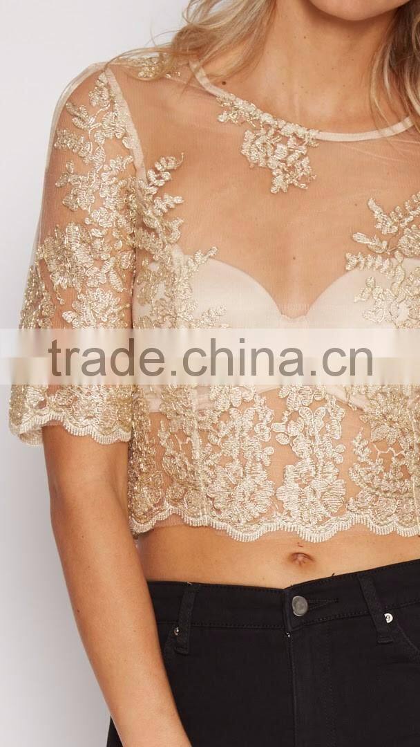 Home > Products > OEM Ladies Tops > Fashion Women Clothes Mesh Lace Cropped Tops Summer Sexy Lady Tops
