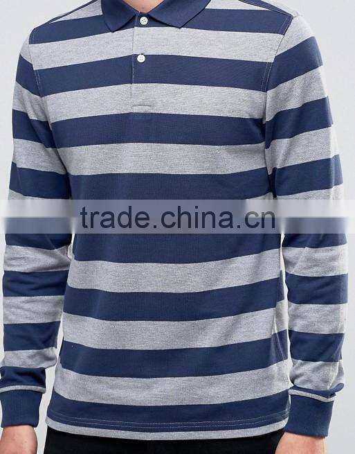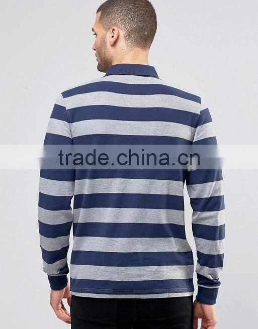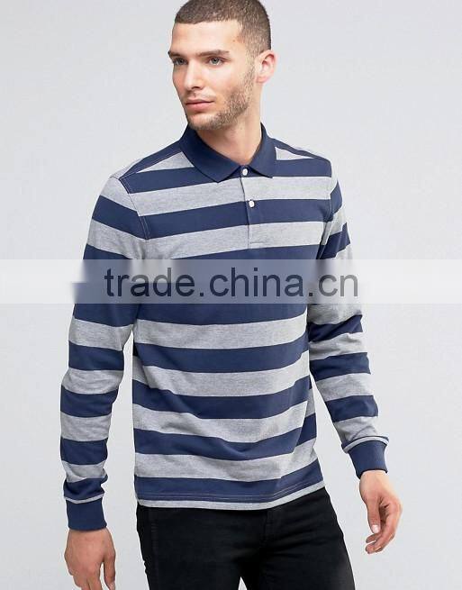 Home > Products > Polo shirt > New Design Long Sleeve Button Placket Ribbed Cuffs Blue Stripe Men's 100% Cotton Breathable Pique 200g Blank Casual Polo T-Shirt