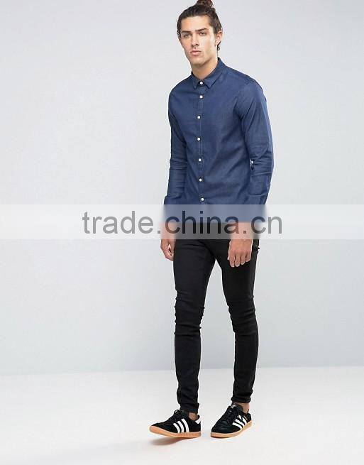 Guangzhou High Quality Custom Long Sleeve Spread Collar Mens Cotton Elastane Stretch Denim Casual Navy Solid Shirts