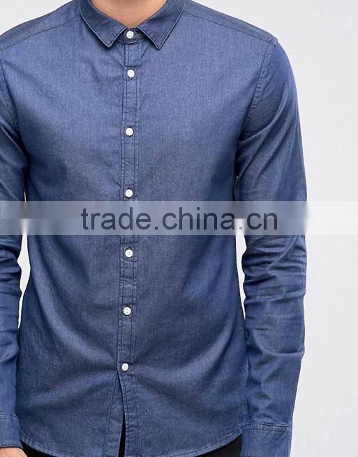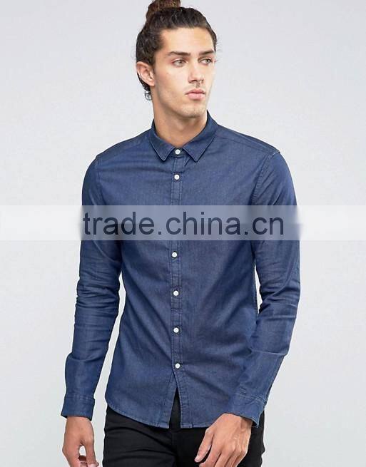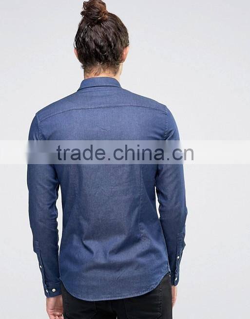Home > Products > Shirts > Guangzhou High Quality Custom Long Sleeve Spread Collar Mens Cotton Elastane Stretch Denim Casual Navy Solid Shirts