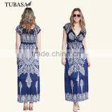 Western Fashion Women Wear Short Sleeve Blue Printing Deep v Neck Maxi Dresses