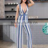 Women Sexy Deep V Stripe One Piece Jumpsuit With Long Pants