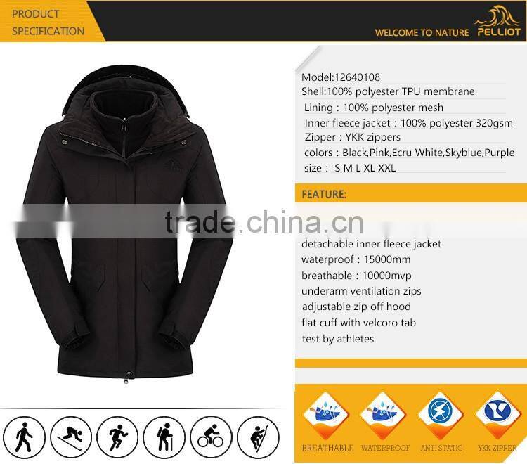 Specification | Sport Type: Hiking & Climbing Shell:100% Polyester TPU Membrane Inner fleece jacket:100% Polyester Zipper: YKK Colors: Size: S M L XL XXL Feature: 3 in 1 outdoor jacket All taped Seams Detachable inner fleece Water Column: 10000mm MVTR: 10000g/m2/24h Adjustable Zip off Hood Underarm Ventilation Zips Flat Cuff with Velcro Tab