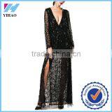 Yihao 2016 Sexy Nighty Ankle-length Long Sleeve Deep V Two Split Sequin Maxi Dresses of Woman Dress