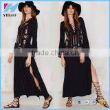 Yihao 2017 Woman Long Dress Sexy Deep V-Neck Black Hippie Chic Embroidery Long Sleeve Maxi Dresses With Slit Women Clothing