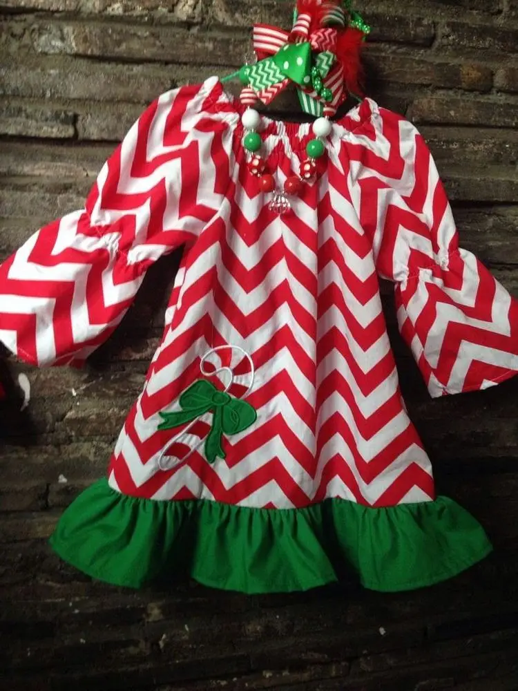 Home > Products > Girls Dress > Baby Girls Christmas Red White Chevron Candy Cane Dress With Matching Hair Bows and Chunky Necklace Set