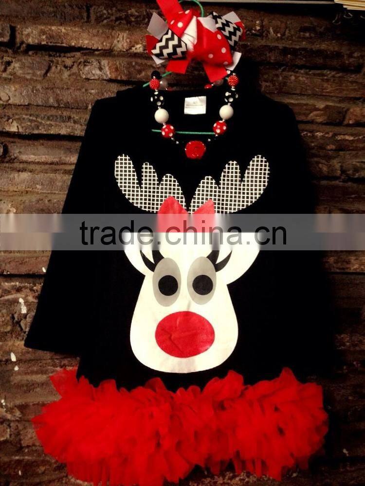 Full Stock Reindeer Long Sleeve Christmas Top X-mas Design Red Sequin Dress Girls Party Dress With Matching Accessory Set
