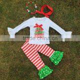 New Design Christmas Kids Clothing Winter Clothes Hot Sell Christmas Tree Embroider White Top Ruffle Pant With Matching Headband
