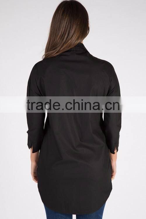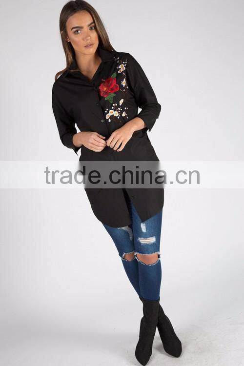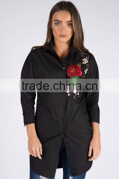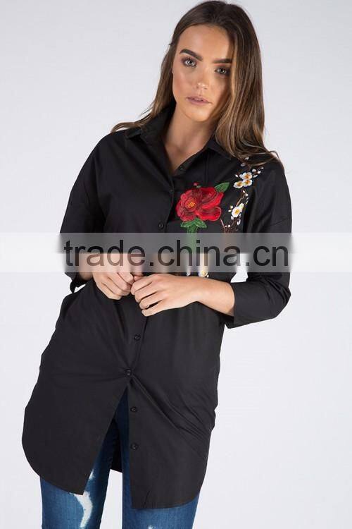 High Fashion Long Sleeve Black Women Cotton Shirt With Embroidery